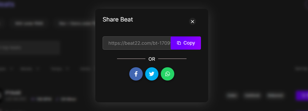 Found a beat you love and want to share it with your friends, artist, or producer? Beat22 makes it super easy to share beats directly from the platform in just a few clicks.