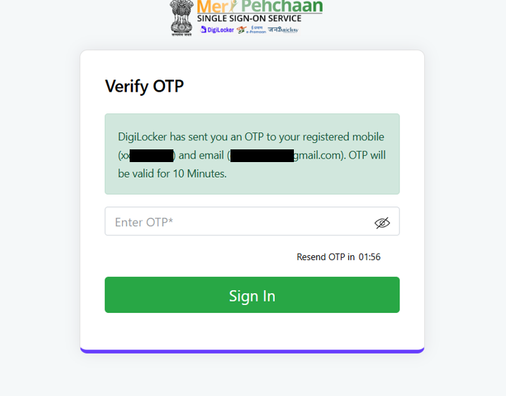 9. You’ll receive an OTP on your registered mobile number, enter it and click Sign In again.