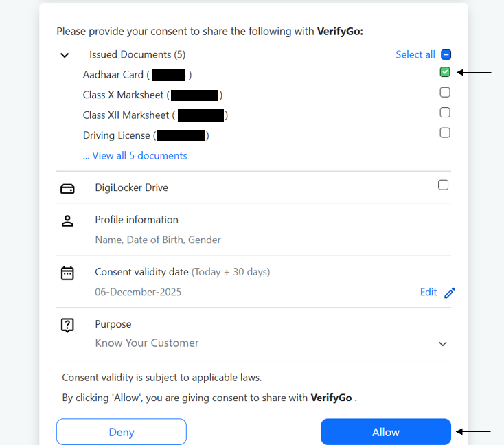 10. A final DigiLocker popup will appear. Tick on Aadhaar Card and click Allow.